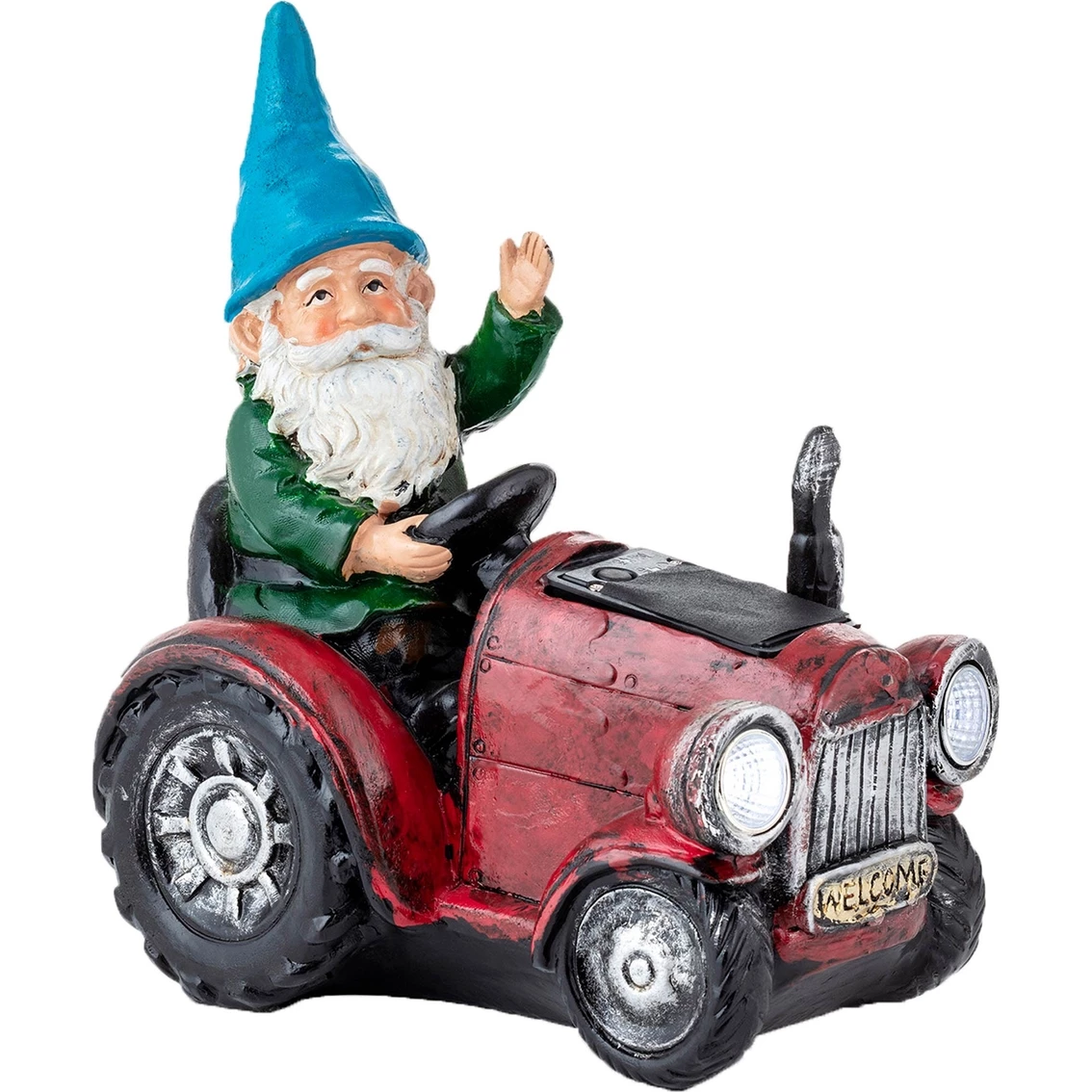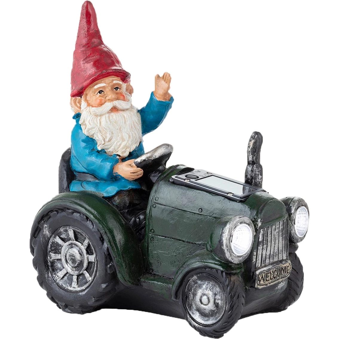 Add a lively and playful look to your outdoor decor with this Alpine 10 in. Tall Outdoor Garden Gnome Riding Green Tractor with LED Lights. Let this friendly gnome greet you throughout the day and wish a warm welcome to all your guests. This durably crafted statue is a perfect decoration for any occasion. Whether you use this as a decoration in your garden, on the patio, on your deck, or near the entranceway in front of your home, Alpine’s sculptures are sure to bring a playful and inviting atmosphere, while leaving a long-lasting impression. Model: WQA1378SLR-GN.