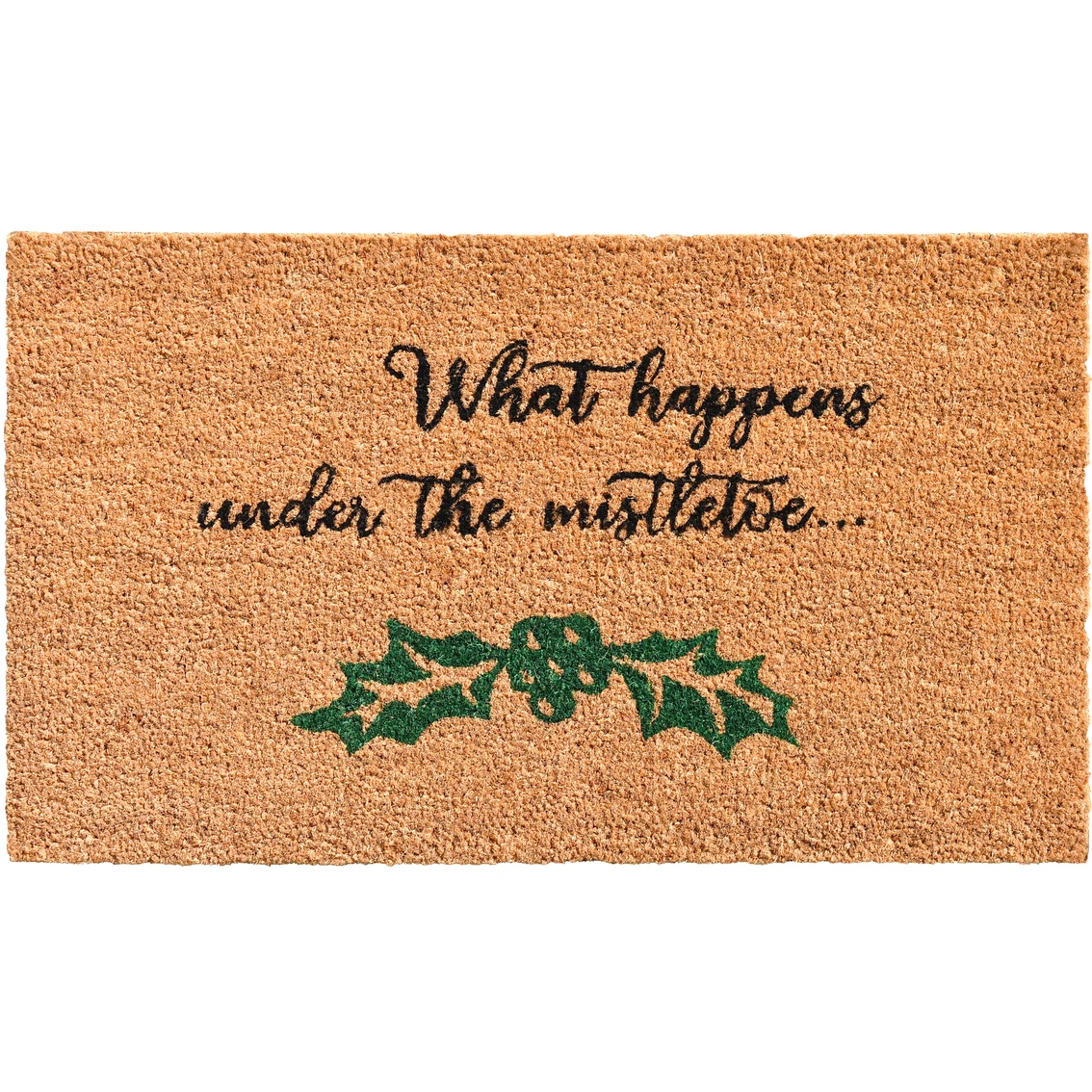 Callowaymills Mistletoe 17 x 29 in. Doormat is made of natural coir, a dense fiber that is naturally mold and mildew resistant. Coir is a renewable resource that is durable and coarse, excellent for scraping shoes clean. Vinyl backed for increased durability and to help prevent movement, this coir doormat is weather tolerant, absorbs moisture and retains its shape. For best results keep in a sheltered area such as a covered porch, keeping extreme moisture and sunlight to a minimum. Vacuum, sweep or lightly hose clean. Model: 105061729.