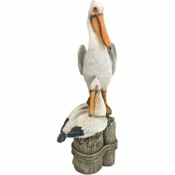 Fresh from a seaside perch, this beautiful pelican statue evokes dreams of an oceanside lifestyle! Beautiful near pool or pond, our animal sculpture is cast in two feet of quality designer resin, hand-painted to capture details from the faux wood pilings and sturdy ropes to the downy feathers and long bills. Whether seeking out fish or fishing for compliments, this Design Toscano-exclusive bird sculpture will garner praise in home or garden. Dimensions: 9 in. W x 9 in. D x 24 in. H. Weight: 5 lb. Model: QL56458.