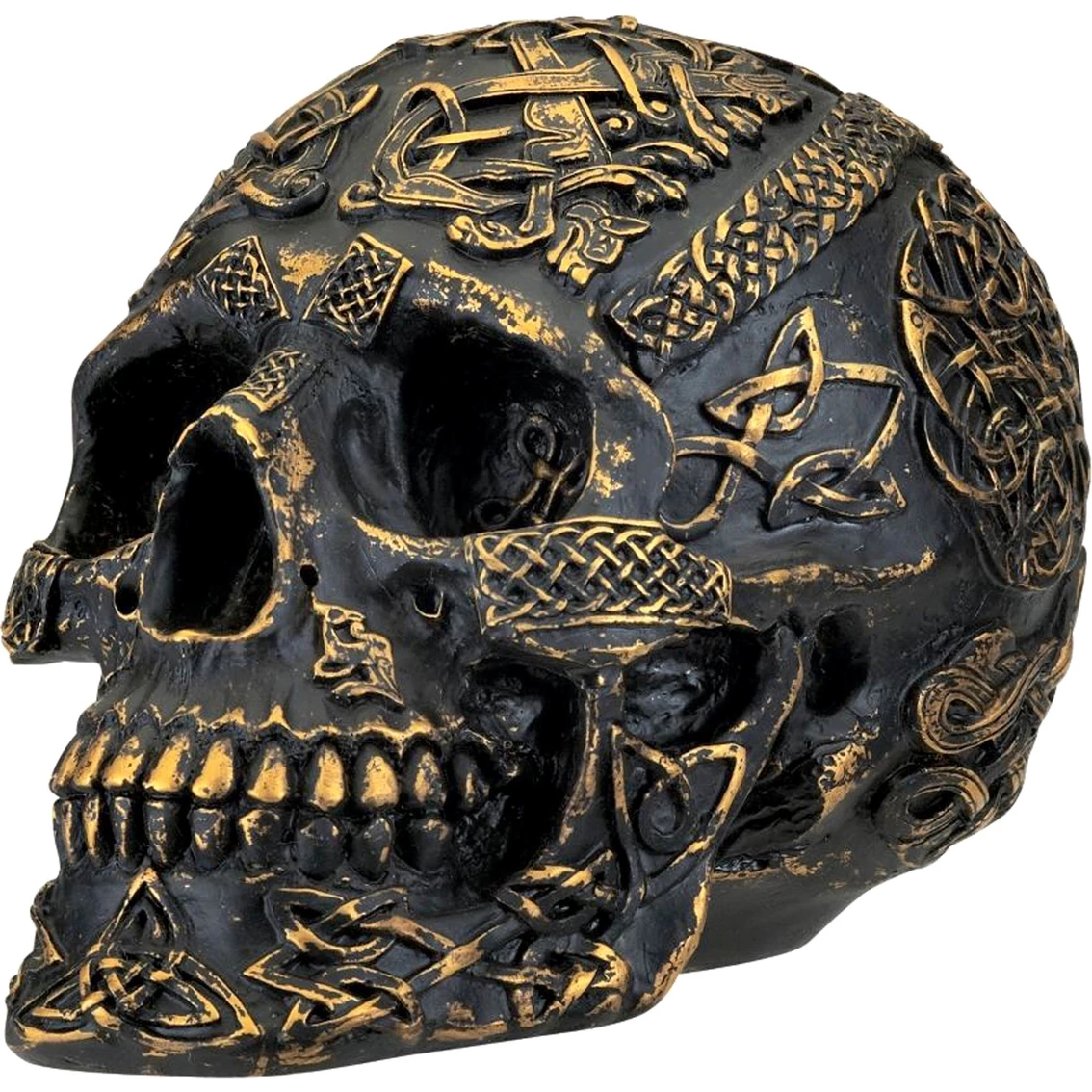 Combining the artistry of interwoven Celtic knots and crosses atop a human skull sculpture, artist Tipton adeptly translates the ancient symbology of the passage of life in this Toscano exclusive. This work of Celtic art, created in quality designer resin and highlighted in faux gold and ebony, is a uniquely poignant work from a people whose history reflects the fine line between the worlds. 5 x 8 x 4.5 in. 2 lb.
