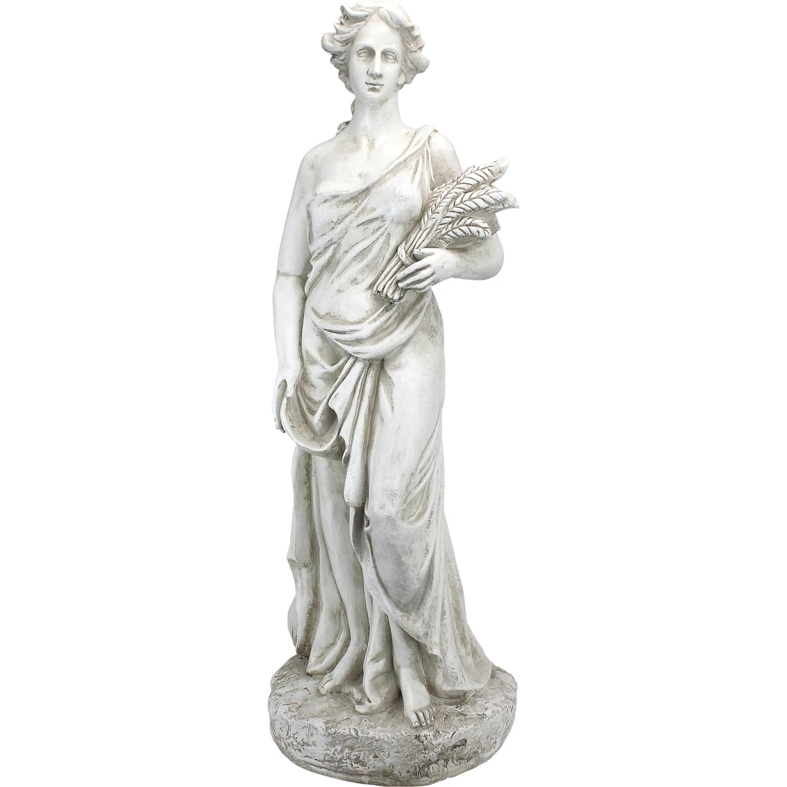 An allegory conjuring one of the goddesses of the seasons in the Neoclassical style, the Summer Goddess is holding a sheaf of harvested wheat. Drawn from the Roman tales of the voluptuous goddesses known as the Horae, this classic lawn ornament is based upon an English estate original and is mesmerizingly detailed from draped gown to handsome face. Cast in quality designer resin, our Design Toscano classic sculpture is finished in antique stone for seasons of enjoyment.