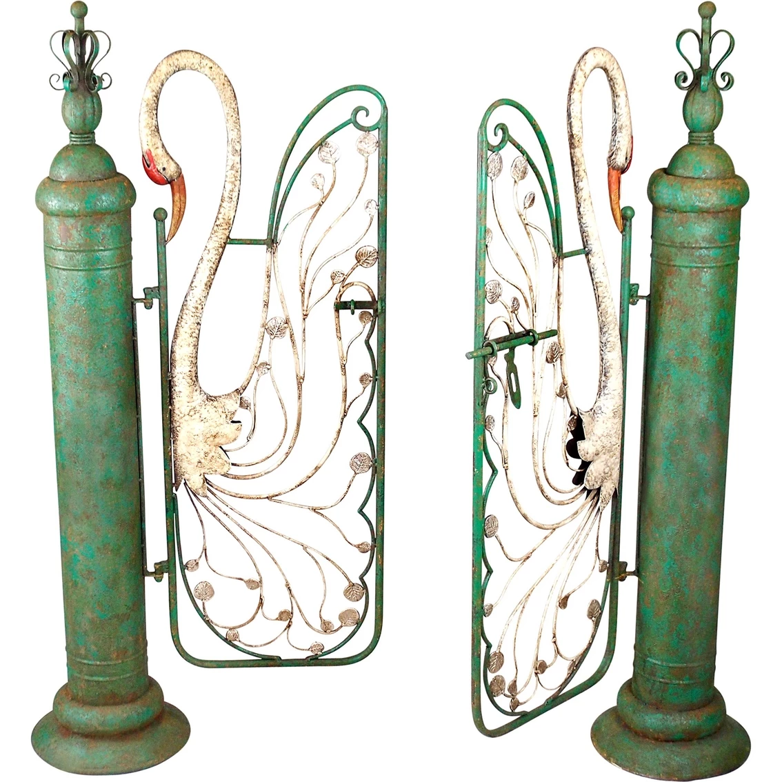 Double swan gates in delightful Art Nouveau style will formally welcome your guests with invitingly ornamental garden architecture. Beautifully ornate and more than 4-feet-tall, the open fretwork design is secured by sturdy newel posts with crown finials. Sure to be the envy of your neighborhood, this high-style doorway is an opulent Design Toscano exclusive that makes an aesthetically pleasing statement with a precision-cut, all-metal structure and a faux aged, distressed paint finish. Bolt holes on each newel post allow for easy and optionally permanent installation. With impressive flair, this easily positioned garden focal point ushers in a most beautiful lifestyle. Simple assembly required. Model: FU76162.
