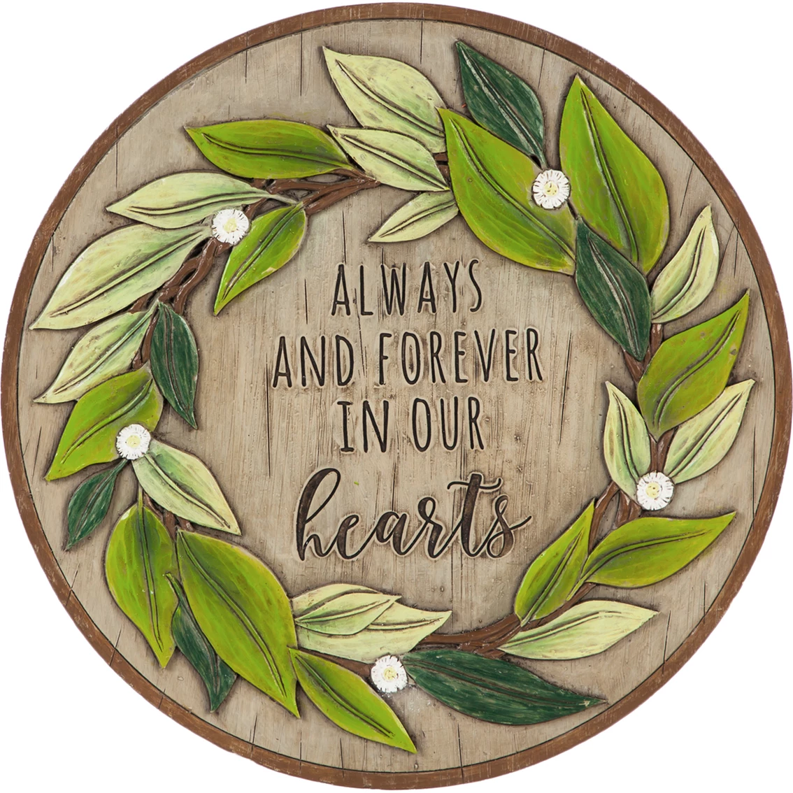 This 10.75-in. round polystone memorial garden stone by Evergreen features a green leaf wreath against a woodgrain. It reads, “Always and forever in our hearts.” Outdoor safe. Model: 84G2432.