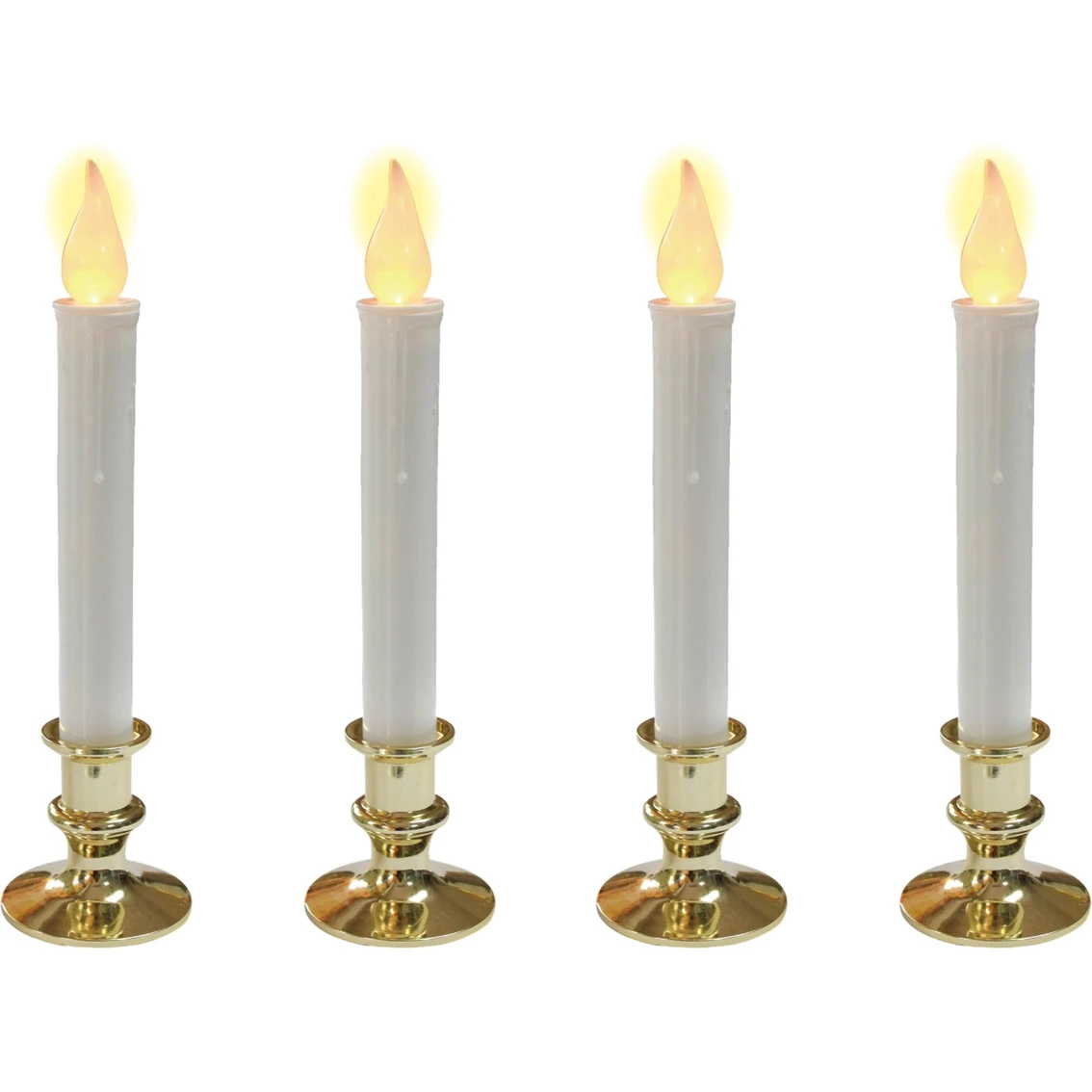 This battery-operated flickering white LED candle from Everstar has a tear drop and gold-plated plastic baseuse. 2 “aa” batteries (not included). Yellow flickering LED. 4-pk. Model: ES60119A.