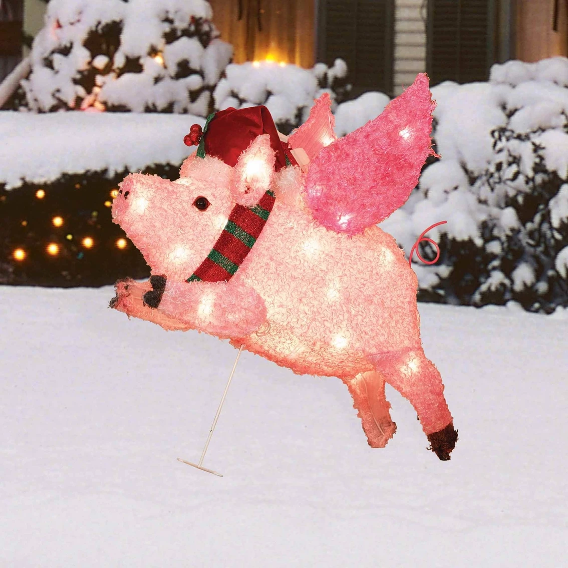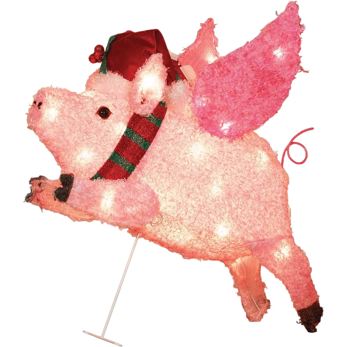 This impressive 26 in. Fluffy Flying Pig Sculpture from Everstar has coated metal frame with fluffy fabric and is prelit with 35 clear incandescent lights. Sculpture is for indoor and outdoor use. Metal stakes are included. Model: ES69-691.