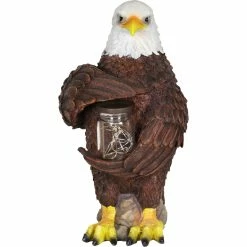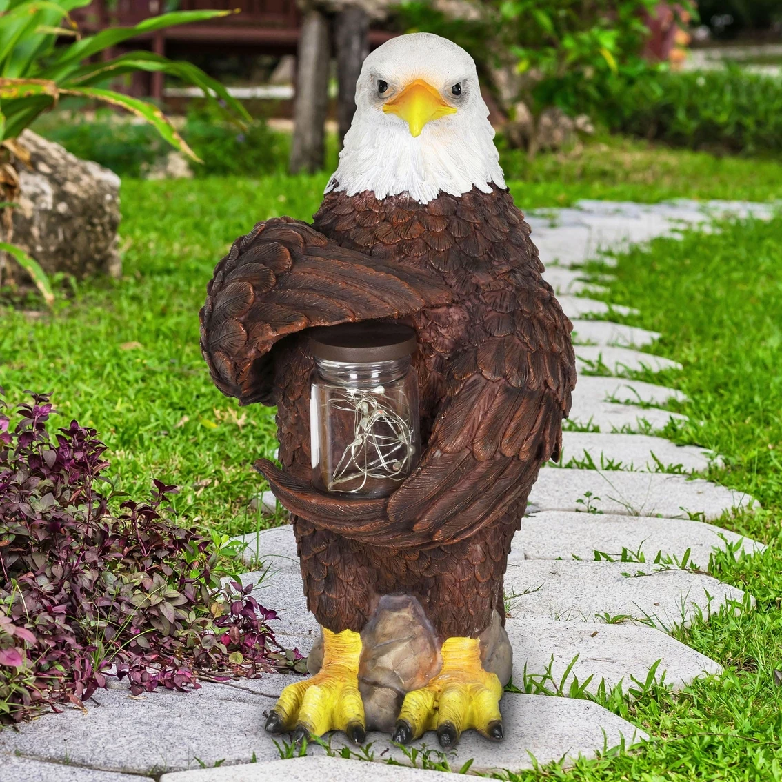 This solar regal eagle from Exhart holds a magical jar of glowing LED fireflies! A string of 6 Solar powered LED lights will magically illuminate in the jar at dusk bringing this adorable garden art to life. An endearing addition to your garden dรฉcor.