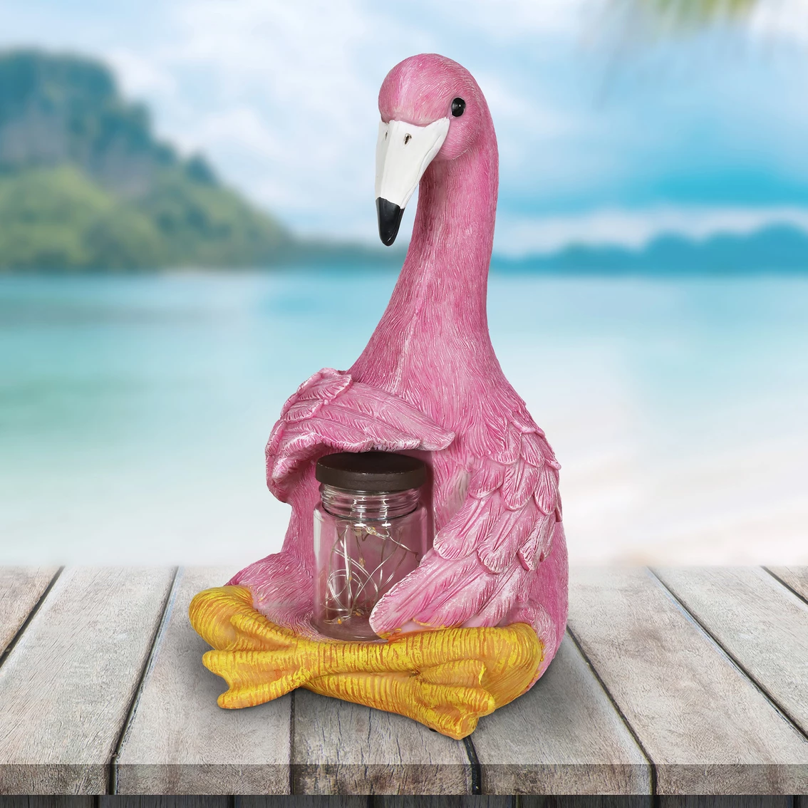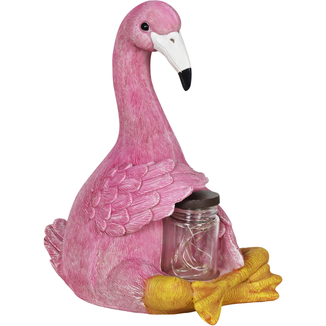 This solar tropical garden flamingo from Exhart holds a magical jar of glowing LED fireflies! A string of 6 solar-powered LED lights will illuminate in the jar at dusk bringing this adorable garden art to life. Makes a fun and endearing addition to your garden decor. Model: 16395-RS.