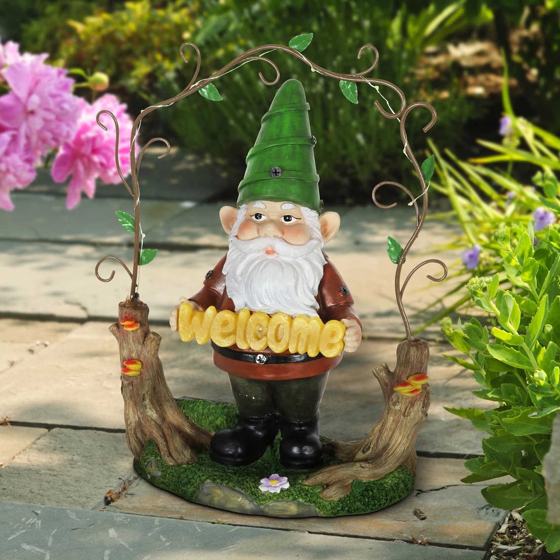 A charming trellis with a creeping solar vine frames this adorable Welcome Gnome from Exhart. Enjoy the glow of the solar LED lights as they automatically illuminate both the vine and the welcome sign at dusk. A perfect addition to your garden and a delightful way to greet your guests! Model: 17507-RS.