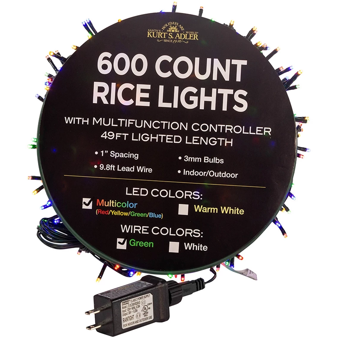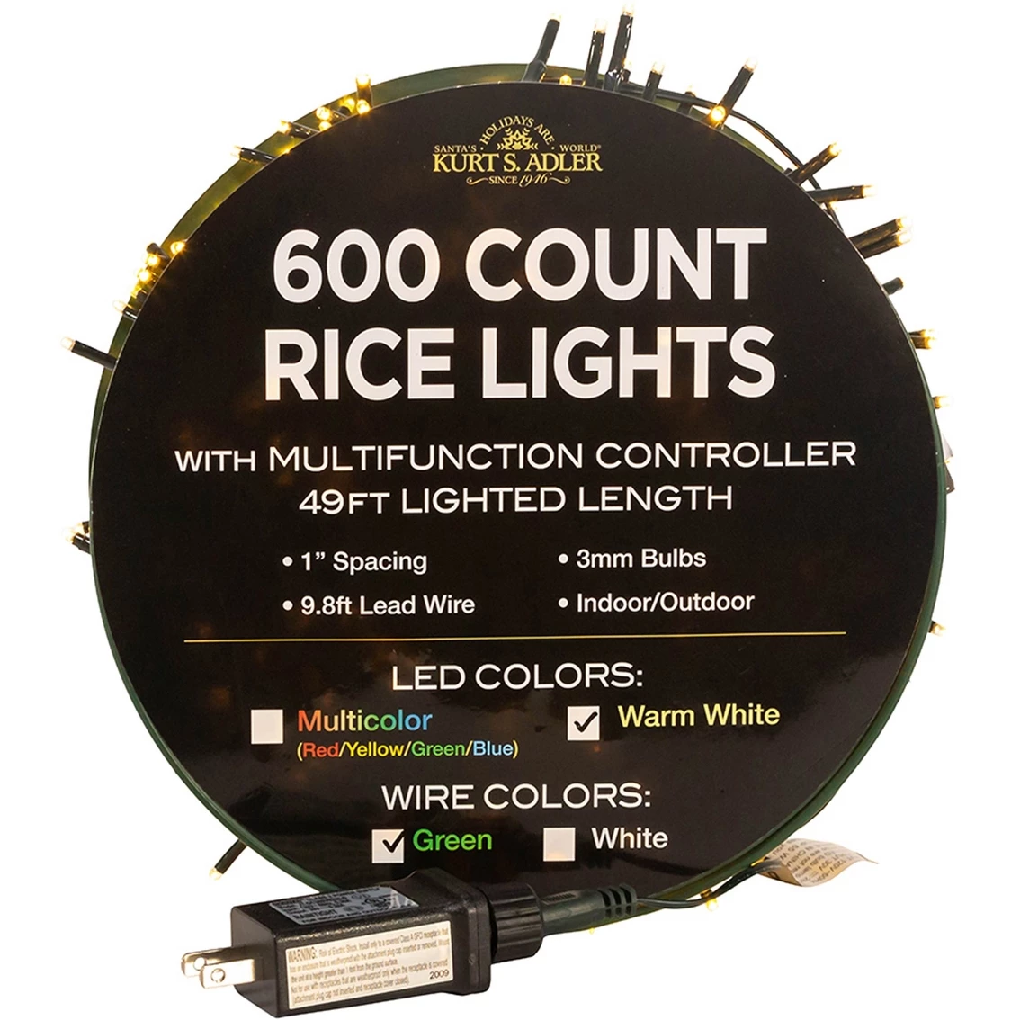 This set of 600 LED rice lights from Kurt S. Adler will add a festive touch to your Christmas decor. The string of lights come rolled on a wheel for easy storage and measures 58.8 ft. in total length unrolled with 49 ft. of lighted wire. The wire is green in color to easily blend in with greenery of a Christmas tree or wreath. Made of plastic, copper, PVC and iron. For indoor and outdoor use. Model: AD1034.