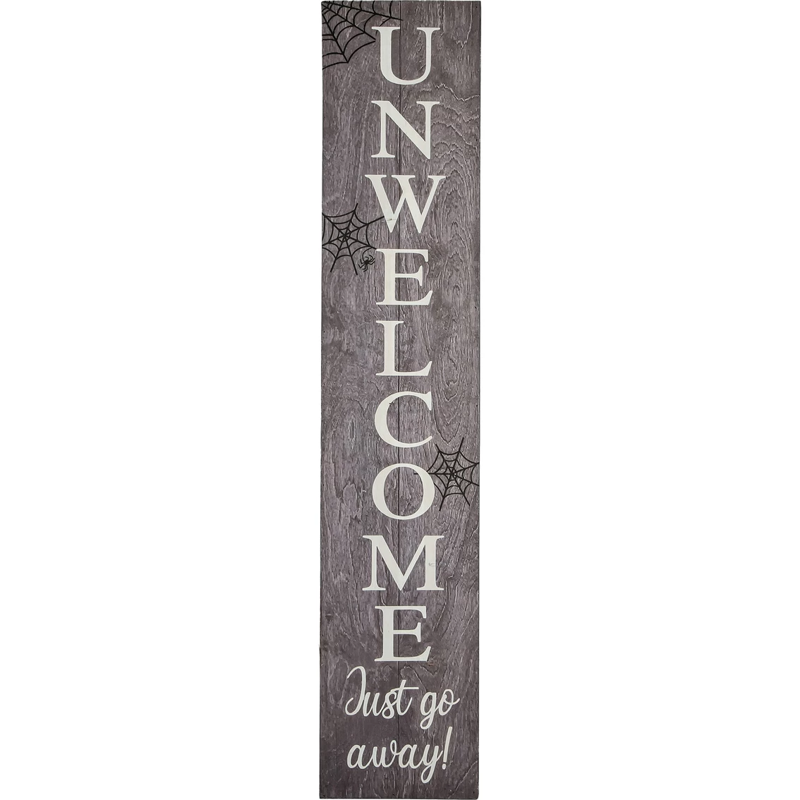 Get in the Halloween season spirit with this not so welcoming porch decoration from National Tree Company. It is constructed of lightweight composite wood material with the words “Unwelcome” stacked vertically over a script lettered “Just go away!” to punctuate the message. The background has a contrasting dark gray woodgrain finish that includes spider webs for added creepiness. Display this tongue-in-cheek decoration in indoor or outdoor locations by leaning it against a wall or by hanging it using the attached backside hardware. Model: RAH-1155RA21019.