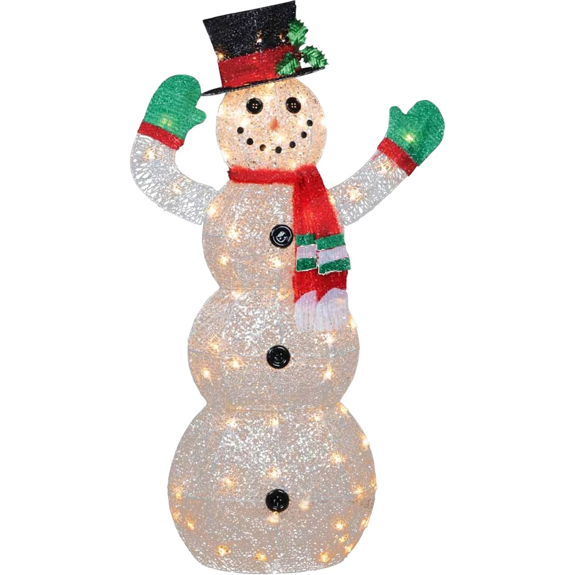 This waving snowman figure from National Tree Company is made with rigid sisal material wrapped around a wire frame creating a strong and durable holiday trimming. It is pre-lit with 70 clear mini lights that make this decoration sparkle and shine. This snowman features black top hat, red scarf, carrot nose, button eyes and green mittens. Display this decorative piece in indoor or outdoor locations. Model: DF-070114C.