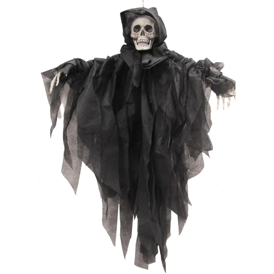 This reaper, shrouded in black with only his skull and hands visible, is sure to create a lot of commotion at your haunt or Halloween display. Every haunt should have a reaper, and this one would be perfect. Very ominous and scary! This measures approximately 29.5 in. x 23.6 in. x 3.1 in. Style: SS72372.