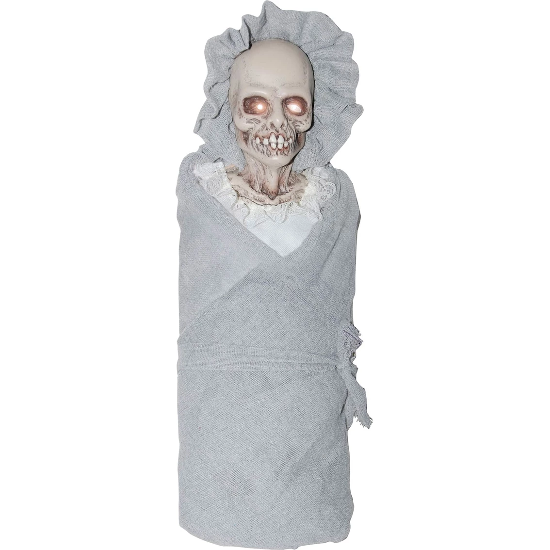 Everyone loves a baby…until they see this one! A great prop for your haunted house or home haunt, this creepy baby doll will leave quite the impression. It spooks with a skeleton head wrapped in bunting and eyes that light up. Creepy cradle songs add to the ambiance. Uses 3 AA batteries, sold separately. 26 in. x 8 in. x 8 in. Model: SS70419.