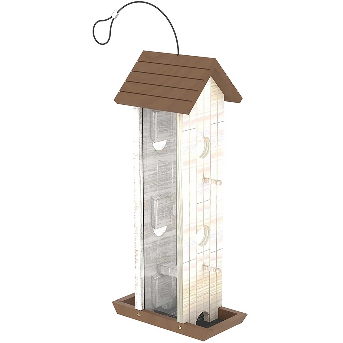 Introducing the line of Stokes Select wooden bird feeders. This Classic Brands Stokes Select Tower Wood Bird Feeder is tall enough to hold a large capacity of seed and perch six birds comfortably, one at each port. The screen diffuser at the bottom of the feeder allows for maximum airflow to allow seed to dry quickly after wet weather. The colors are beautiful with a whitewash along the walls and dark brown top, base, and perches. This feeder has pine pieces that are held together with sturdy screws, sure to keep the feeder from falling apart. Plexiglass shows how much seed is left. Model: 38081.