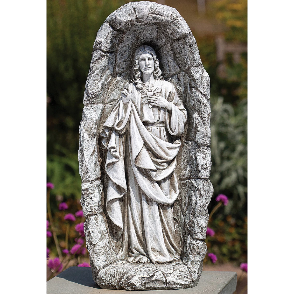 A beautiful Roman Joseph’s Studio 18.75 inch LED Solar Sacred Heart decorative display. The Joseph’s Studio collection focuses mainly on inspirational figurines and garden statuary. His portrayal of Jesus, various saints, nativities and garden angels have a unique style that is highly regarded. Model: 602153.