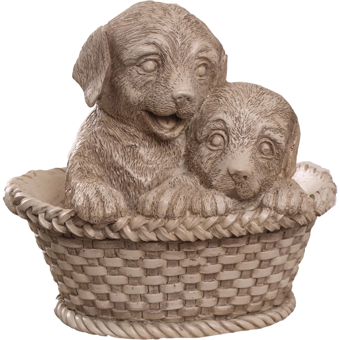 Adorable accent for your home or garden. Carved out of resin, with an antique finish, these puppies in a basket will add a touch of whimsy to your home.